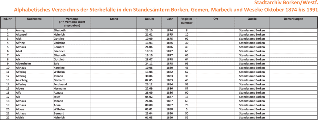 Hier fehlen aber die alphabetischen Namensverzeichnisse der vier Standesämter, die bis zur kommunalen Neugliederung Anfang Juli 1969 auf dem Gebiet der heutigen Stadt Borken bestanden: Borken, Gemen, Marbeck und Weseke.